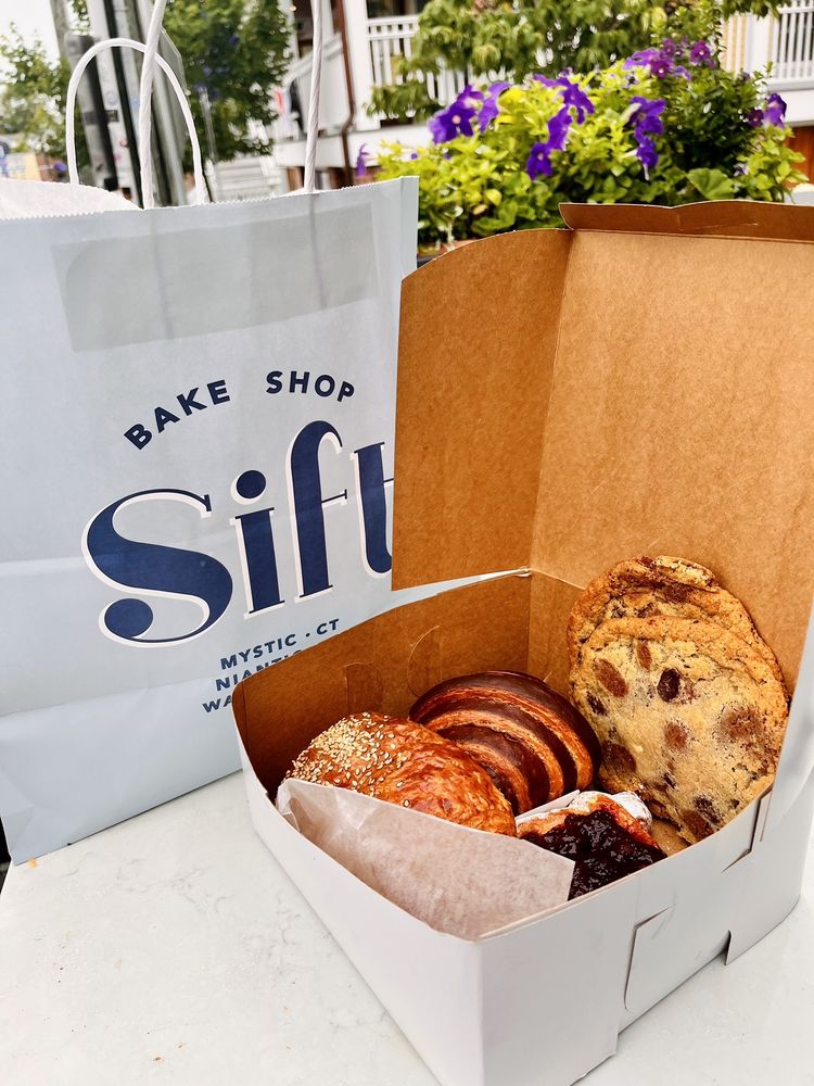 Sift Bake Shop in Mystic, CT is a renowned bakery offering a variety of delectable pastries, croissants, cakes, and cookies. The menu features options for gluten-free, vegan, and vegetarian preferences, with standout items like almond croissants and chocolate chip vegan cookies receiving high praise. Customers appreciate the excellent service, cozy atmosphere, and the wide range of beverages, including oat milk lattes and coffee drinks. Although there may be a wait due to high customer traffic, the quality of the baked goods makes it worth the visit. In addition to the Mystic location, Sift has bake shops in Niantic, Mohegan Sun, and Watch Hill for those looking to indulge in their delicious offerings. If you're a fan of exceptional croissants and unique baked treats, Sift Bake Shop is a must-visit destination.